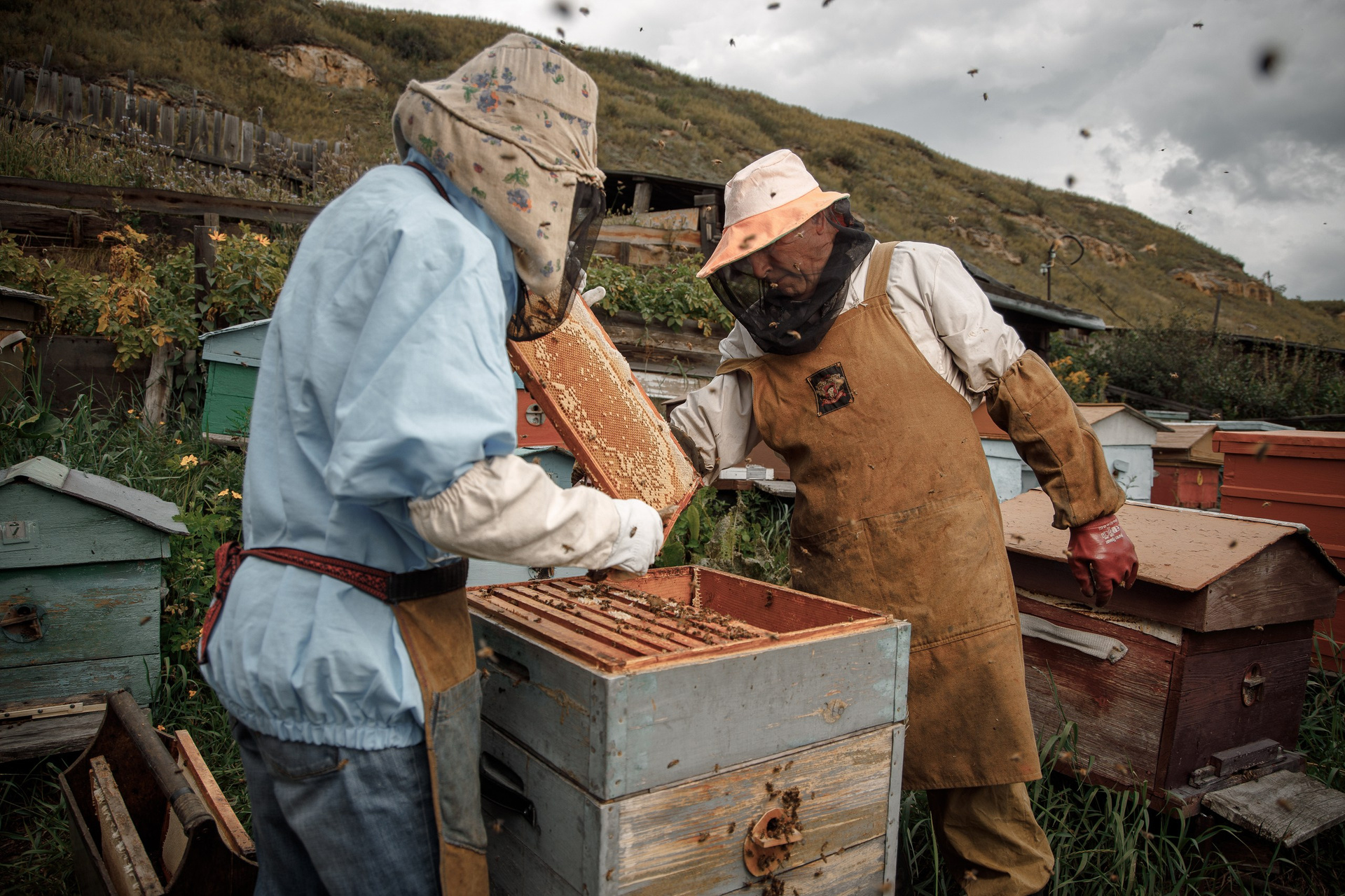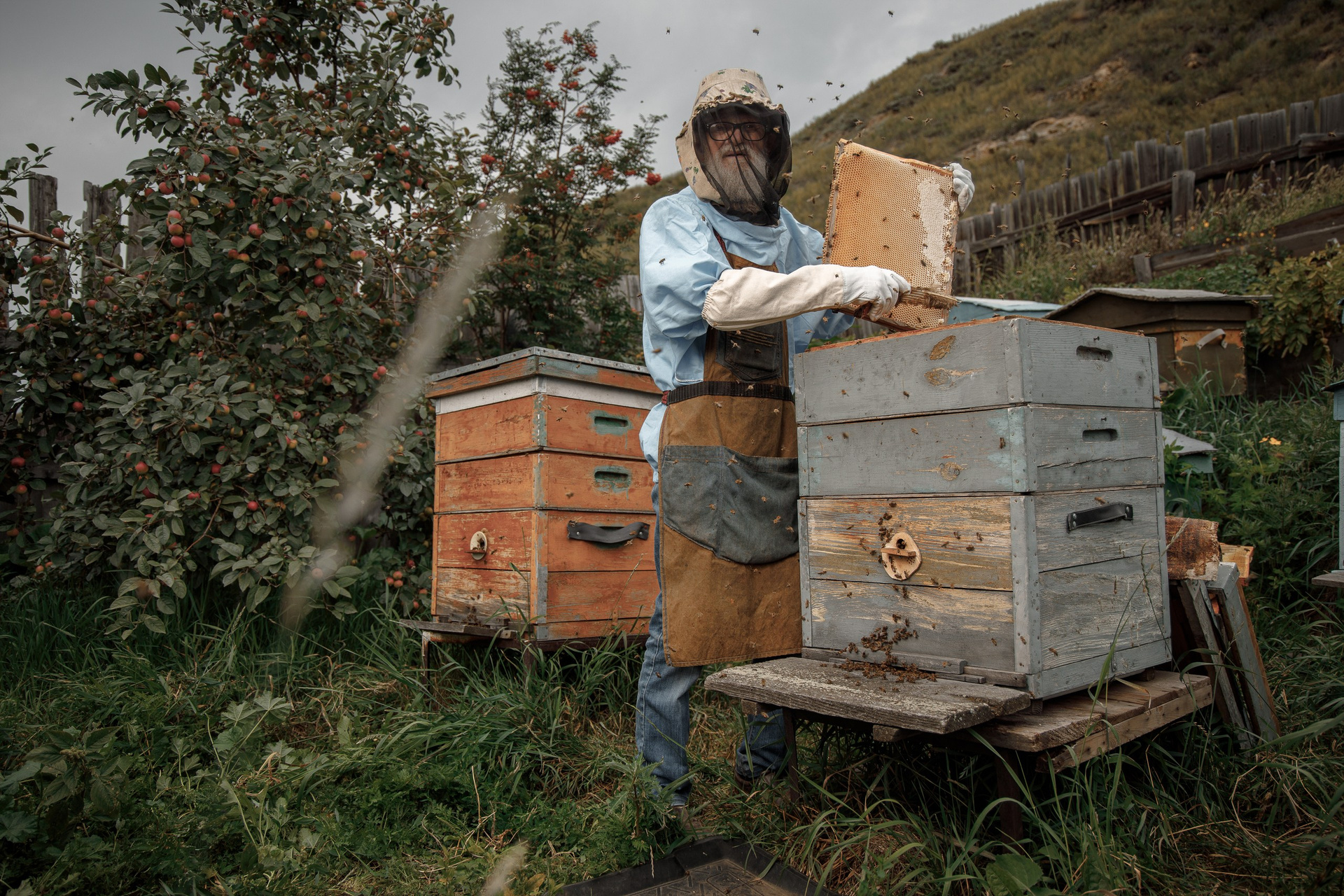 Скажу честно, до этого я никогда на пасеках не был, и с пчелами дело только в детстве имел, воспоминания как они меня кусали, вряд ли можно назвать самыми приятными. И хотя меня оснастили защитным костюмом и маской, загодя предупредили не пользоваться никакими пахнущими веществами, и не бояться, пчелы все это чувствуют. Что же, я не самый смелый человек, но ради хорошего кадра, приходится идти на многое.