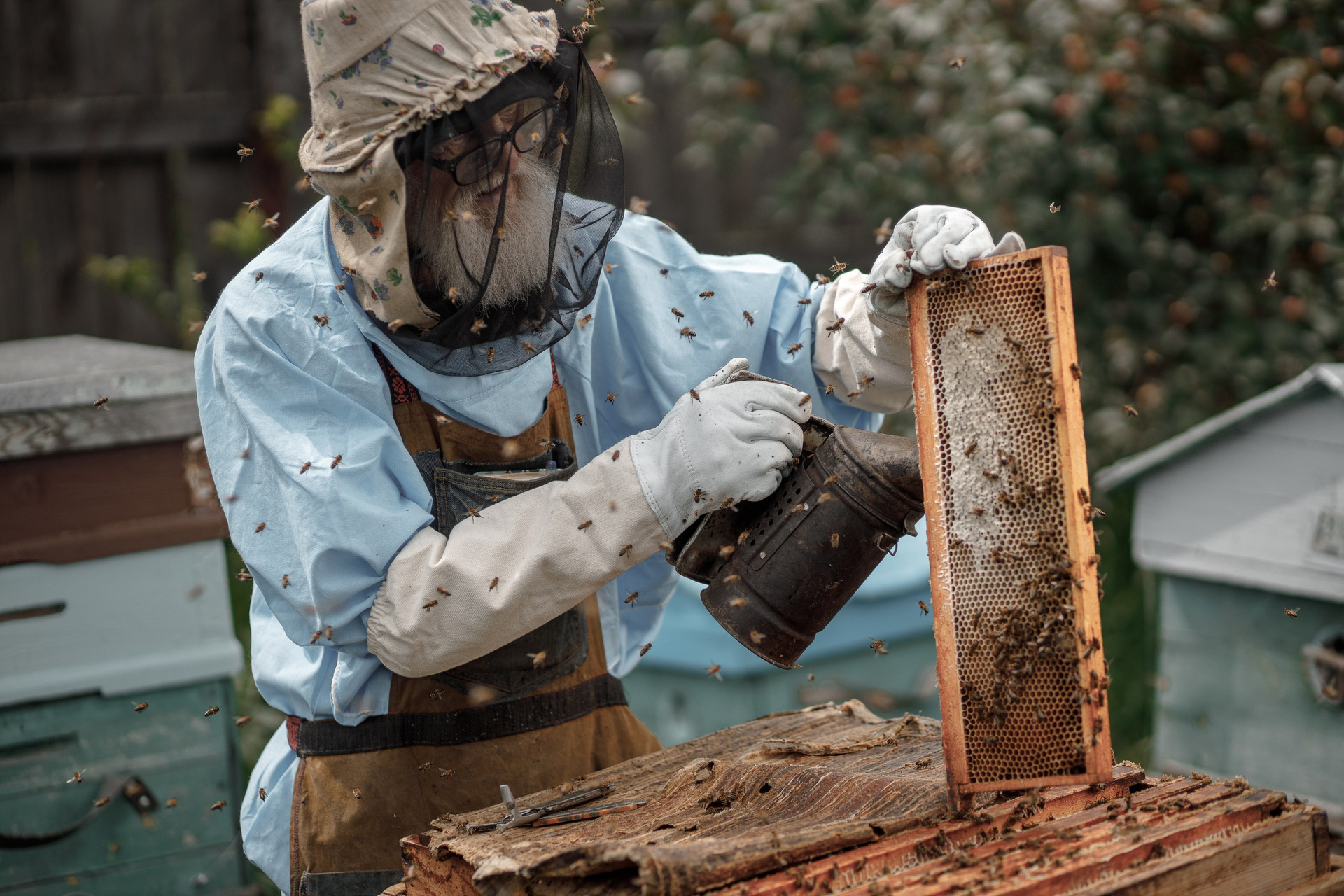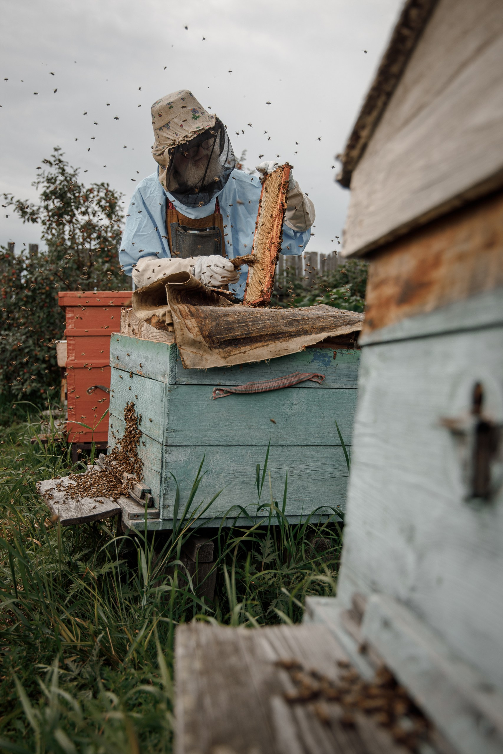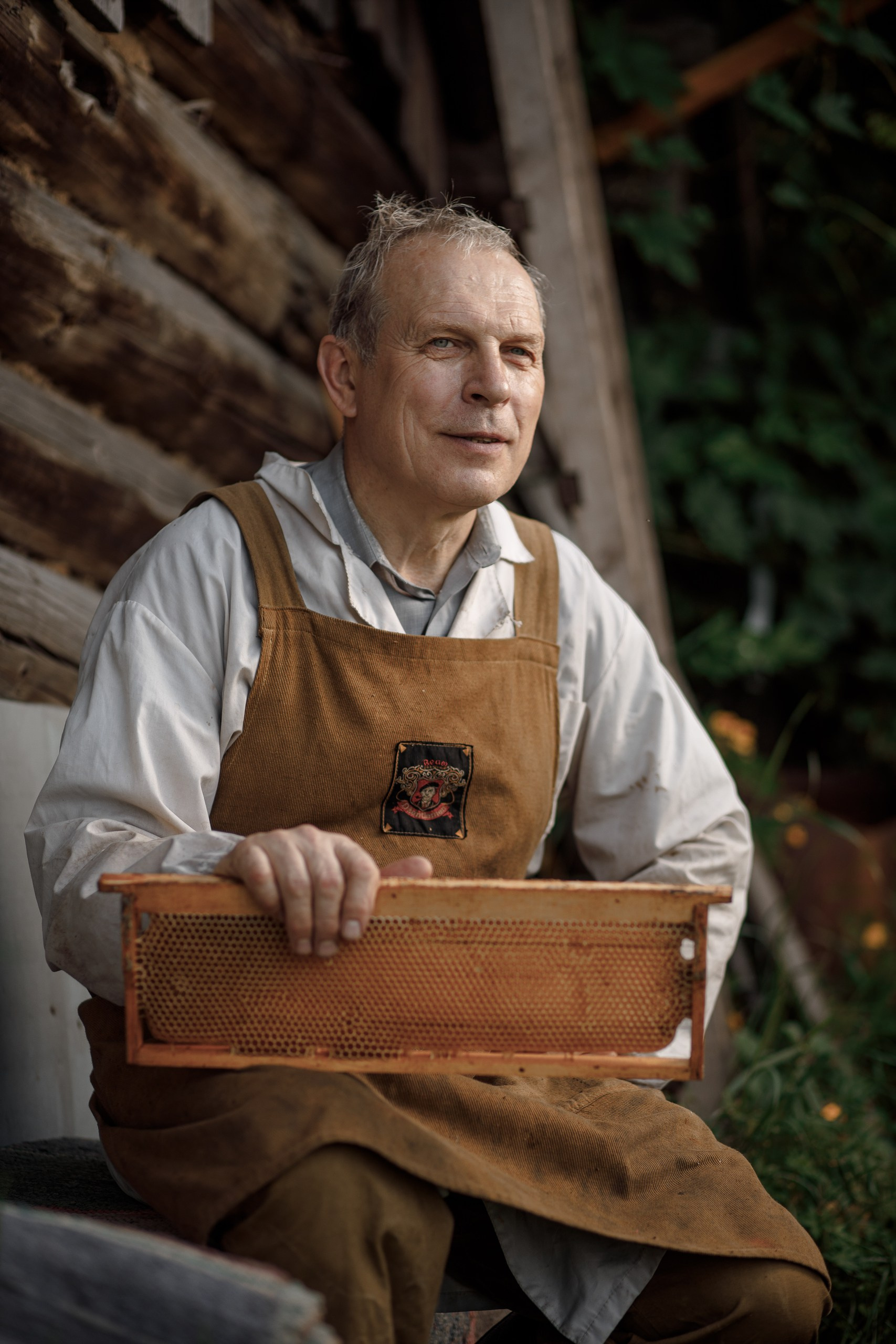 Я снимал его на фоне ульев, с дымарём в руках, с рамкой, тяжёлой от запечатанного золота. Он не позировал. Он просто жил в кадре. В его движениях была та самая многовековая неторопливая мудрость, которую не купишь и не изучишь по книгам. Её нужно впитать с воздухом, с пыльцой, с терпким запахом воска.